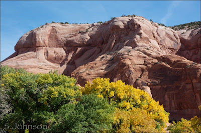 The beautiful sculpted rock of Navajo sandstone forms the backdrop for this group of cottonwoods that are clearly marching to the beat of their own personal drummers as far as commencing fall colors go.